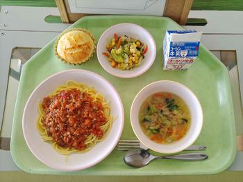 今日のメニューは、スパゲッティミートソース、コーンサラダ、白菜とベーコンのスープ、米粉のマドレーヌでした。