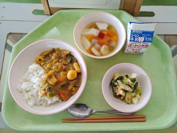 今日のメニューは、豚肉と冬野菜のカレーライス、海藻サラダ、杏仁フルーツポンチでした。