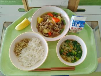 今日のメニューは、ごはん、たくあんふりかけ、肉じゃが、キャベツとわかめの味噌汁、バナナでした。