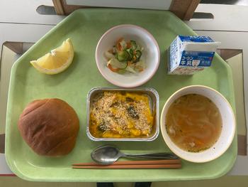 今日のメニューは、ロールパン、かぼちゃとマカロニのグラタン、フレンチサラダ、オニオンスープ、グレープフルーツでした。