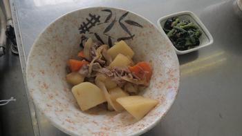 今日のメニューは、ごはん、豚肉の味噌焼き、かむかむ和え、のっぺい汁、リンゴでした。
