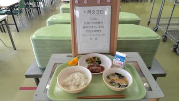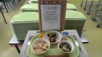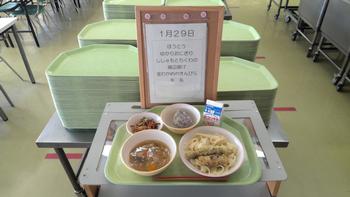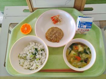 今日のメニューは、七草ごはん、松風焼き、おかかなます、栄養すいとん、みかんでした。