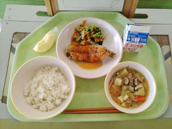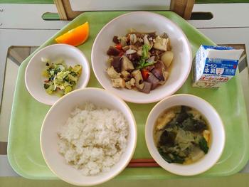 今日のメニューは、ごはん、いわしの蒲焼、野菜のにんにく醤油和え、豚汁、りんごでした。いつも美味しい給食の提供ありがとうございます。