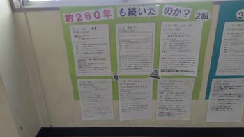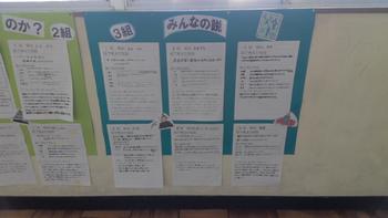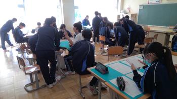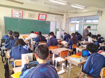 今日は3年生が今年度最後の確認テストを行っていました。私立入試は始まっています。3年生の教室に入ると最後の最後まで頑張る姿が見られました。さすが、受験生という雰囲気が感じられました。また、1年生は毎年実施している英語の調査です。2年後の入試に向けて目の前のことを頑張って欲しいと思います。2年生の廊下には2学期の社会の授業で行われた調べ学習のまとめが貼られていました。