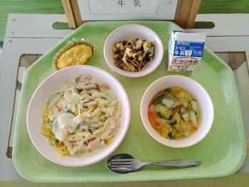 今日のメニューは、鮭のクリームスパゲッティ、ごまドレひじきサラダ、白菜とベーコンのスープ、手作りスイートポテトでした。