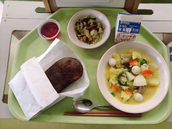 今日のメニューは、ココア揚げパン、ポトフ、海藻サラダ、手作りこんにゃくゼリー・ぶどうでした。