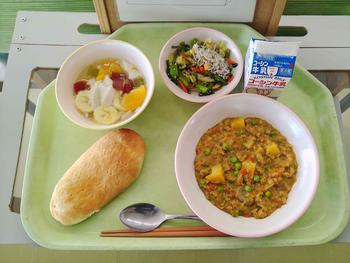 今日のメニューは、手作りナン、キーマカレー、じゃこのサラダ、サイダーポンチ・豆乳デザートでした。