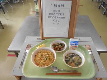 【給食】今日のメニューは、親子丼、野菜のごま和え、具だくさん味噌汁、りんごでした。