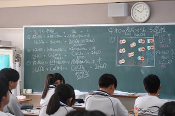 理科の授業です。こりゃまた記号がいっぱい並んでいます。中和の反応が起こる過程を学習しています。