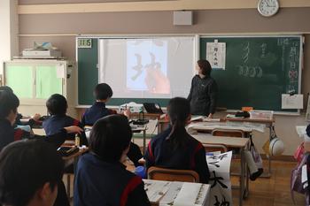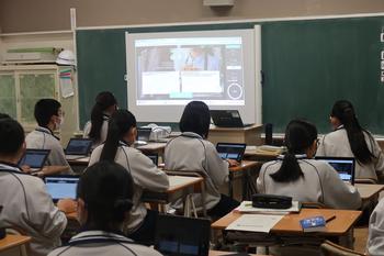 国語の授業では書き初めのついての説明を聞いています。動画を見ながら筆の運び方を確認しています。