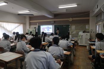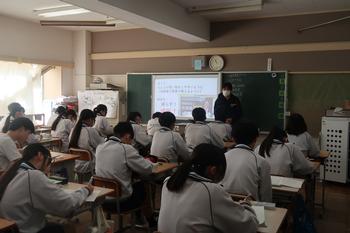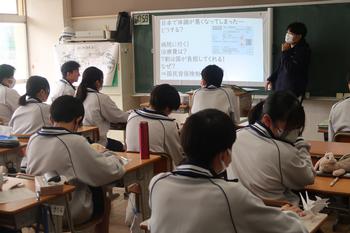 社会科の時間には医療制度の話をしています。スクリーンに映っている形の保険証は使えなくなってしまうらしいですよ。