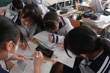 理科の時間に問題集を解いています。一人で黙々と・・・。 友達と協力して・・・。