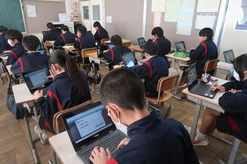 国語の授業ではプレゼンソフトや作文で自分の考えを発表します。