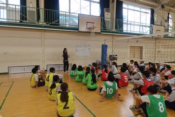 体育の授業ではバレーボールのゲームをします。先生の説明をよーく聞いてからゲームに入ります。