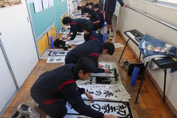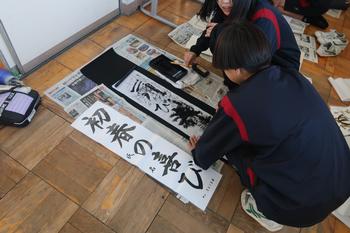 机をどかして、床で書き初めの練習です。教室いっぱいに墨の香りが広がっています。
