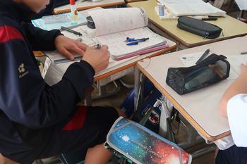 国語の時間に何か書いています。年賀はがきですね。メールやSNSが増えてきてますが、やっぱり年賀状が届くと嬉しいものです。