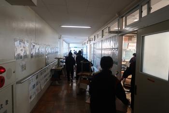 先生が一人一人に言葉をかけながら廊下で渡します。