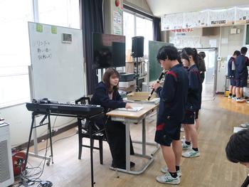 音楽の授業ではリコーダーのテストをしています。音符を読んで頭の中でドレミに置き換えて、抑え方をイメージして。リコーダーは頭と指と口と大忙しだ。