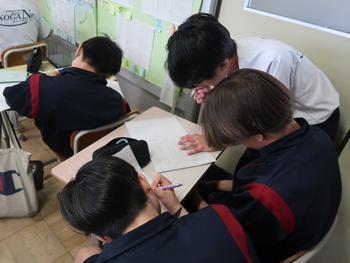 家庭科の授業では住生活について学習しています。今日は理想の住まいについて考えています。どんなレイアウトにしたら住みやすいかな。考えているとワクワクするね。