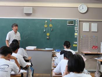 理科の授業では滑車について、先生が模型を使ってわかりやすく説明しています。