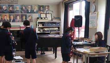 音楽の授業ではリコーダーのテストをしています。音符を読んで頭の中でドレミに置き換えて、抑え方をイメージして。リコーダーは頭と指と口と大忙しだ。