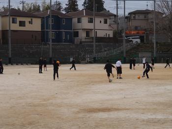 体育はサッカーの授業です。男子も女子も一緒に基本練習です。ボールのけり方や止め方を教え合いながら練習しています。