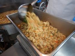 親子丼です。今日は、3年生が3時間授業なので、約400人分を一釜で仕上げました。