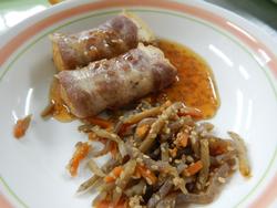 そして、最後に少しとろみの付いたたれをかけて、出来上がりです。横には、きんぴらこんにゃくをのせました。