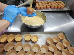 大きなたらいで生地を作り、マフィンカップに一つひとつ入れていきます。