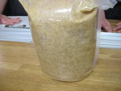 ここでお味噌用のバルブ付の袋をマチまでしっかり開きます。このバルブから余分な空気が出ていき、発酵も見えやすいこの袋がお勧めだそうです。