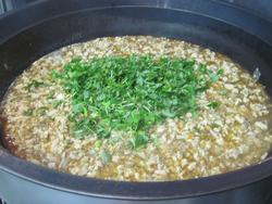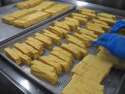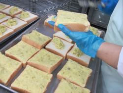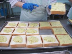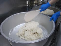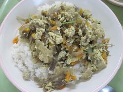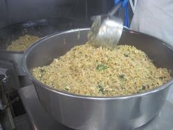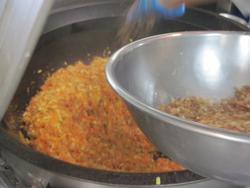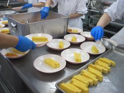 大量料理なので、しっかりと卵に火を通して作っています。本当は、もう少し軟らかい状態で出したい位ですが、安全第一です。