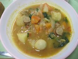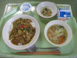 3年1組のIさんの梨のキーマカレー かぶのシーチキンサラダ 鶏肉と白菜のスープ ブルーベリーゼリー 牛乳でした。
