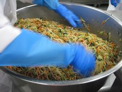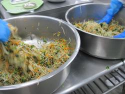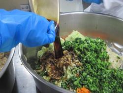 ごま和えです。野菜の水分を考えて、たれを少なめに入れ、一度味見をしてから足すかどうかを決めています。