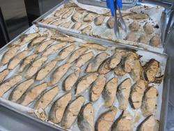ケーキの生地を流し終わると、今度はさんまの粉付けです。もう下味は付いています。