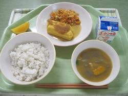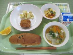 今日は、黒糖パン 3年4組 Tくんの千葉の特産物コロッケ かぶのカレーコールスローサラダ 卵野菜スープ 冷凍みかん 牛乳でした。