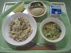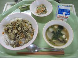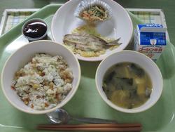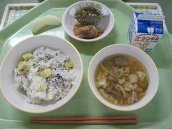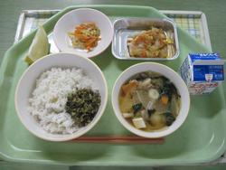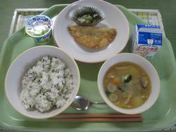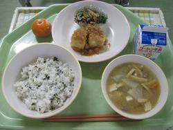 今日は、じゃこ菜ご飯 ししゃものパリパリ揚げ 海藻サラダ 豚汁 ヨーグルト 牛乳でした。