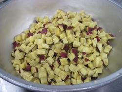 さつま芋の皮を剥き、切って蒸し、潰してスイートポテトを作ります。