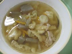 豚肉を豆板醤で炒めてから、他の具材を煮て、最後に卵・ワカメ・長ねぎを入れて仕上げたピリ辛ワカメスープです。