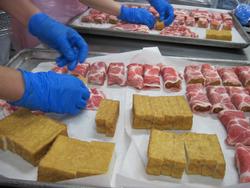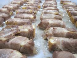 厚揚げを1/6に切り、そこにお肉を巻いていきます。