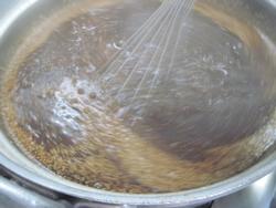 たれにとろみを付け、ゴマを入れたら焼いた肉巻きの上にかけていきます。