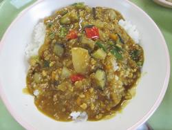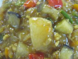 カレーの味が決まったら、素揚げの野菜と、梨を加えて仕上げます。
