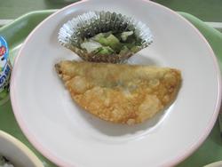 ししゃもに小麦粉とカレー粉をまぶし、しその葉を添えて餃子の皮を半分にたたみ揚げました。