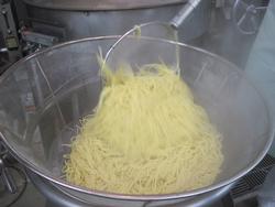 お湯に入れる時は黄色がかった麺が、茹で上がりに近くなると、白くなってきます。