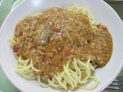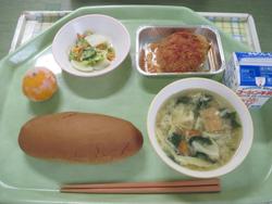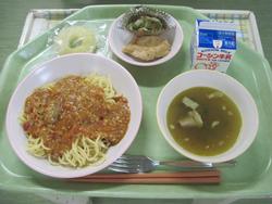 今日は、スパゲッティミートソース タンドリーチキン フレンチサラダ メキシカンスープ 冷凍パイン 牛乳でした。
