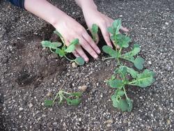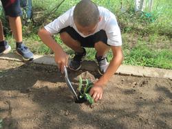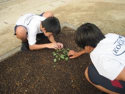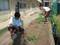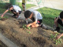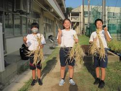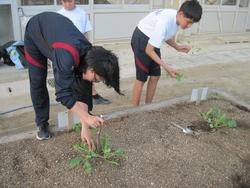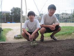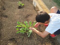 今日は、3年生のSAKURAメンバーズが3人やって来てくれて、虫の取り方や間引きをする時のコツや、間引きした苗を移す穴も掘ってくれていました。