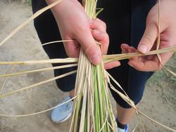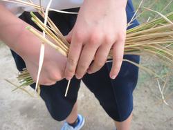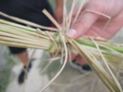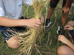 Hさんは昨日、お父さんに教えてもらった稲のまとめ方を知っているので、教えてくれることになりました。