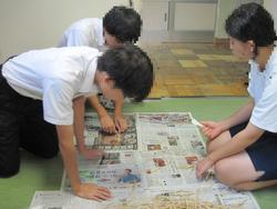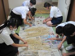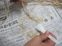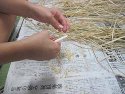 みんなで新聞紙を広げて、そこに藁を置き、脱穀をしていく事にしました。