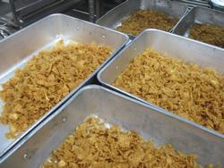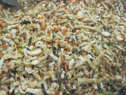 カミカミピラフの具材です。野菜や葱を入れて炒めた後、乾燥大豆を煮て、水分を切り片栗粉をまぶして揚げた物とじゃこを最後に加えて作ります。