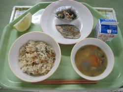 もろこしご飯 鰺の南部焼 フライドさといも(去年、卒業したKさんの南中メニューです) じゃが芋と油揚げのお味噌汁 月見団子(黒糖)でした。