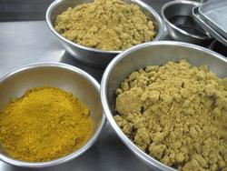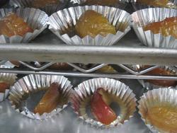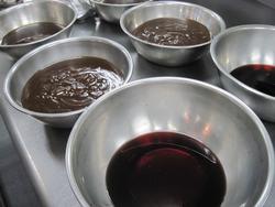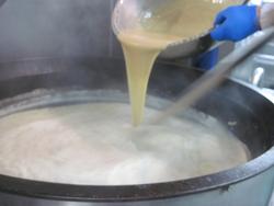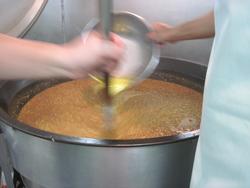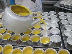 プリンは大きなお釜で作り、やかんに入れ替え、こうして注いでいきます。色を見るだけで、かぼちゃが入っているのがわかりますね。